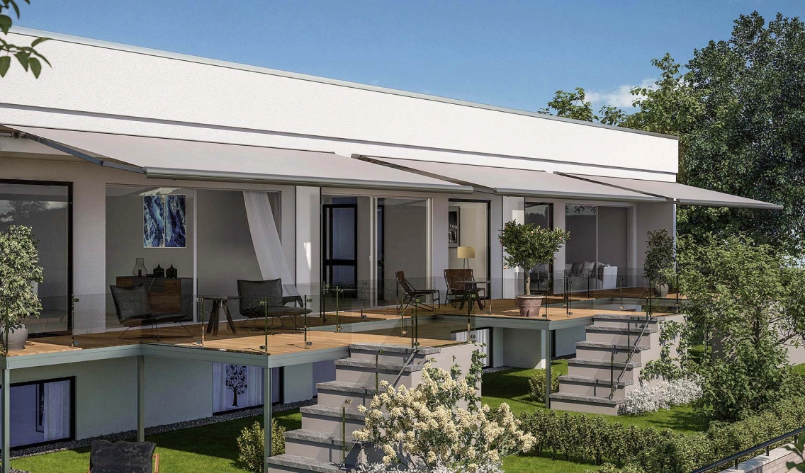 Gelenkarmmarkise mit elegantem Profil und moderner Optik.