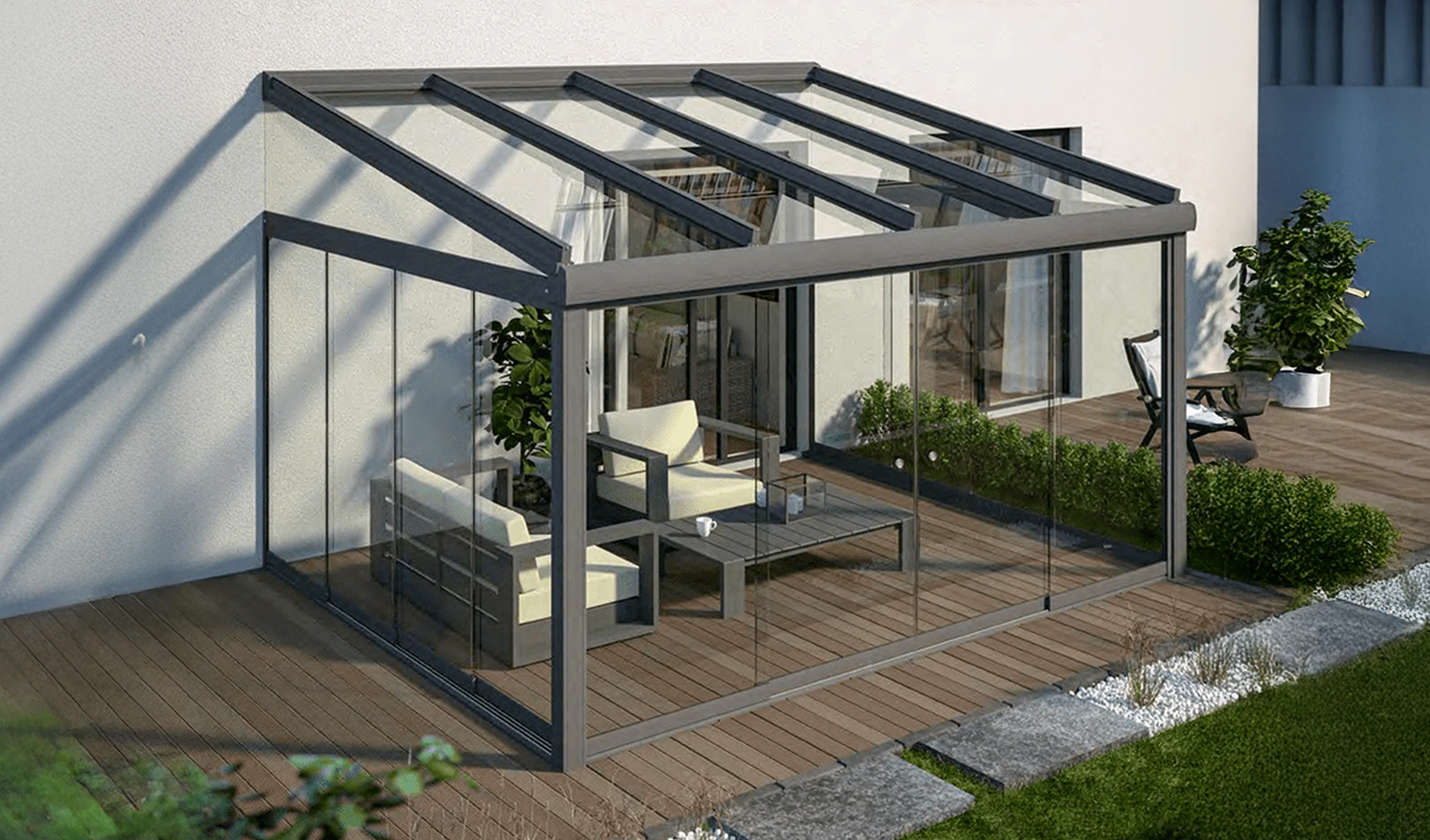 Mehr Freiraum, weniger Kompromisse: Die Glas-Schiebeelemente erweitern Murano-Glasdächer um flexiblen Wind- und Wetterschutz, ohne die Sicht einzuschränken. Bis zu zehn Glasflächen gleiten dank kugelgelagerter, verdeckter Laufrollen leise in Position. Seitlich oder mittig öffnend, passen sie sich jedem Außenbereich an.