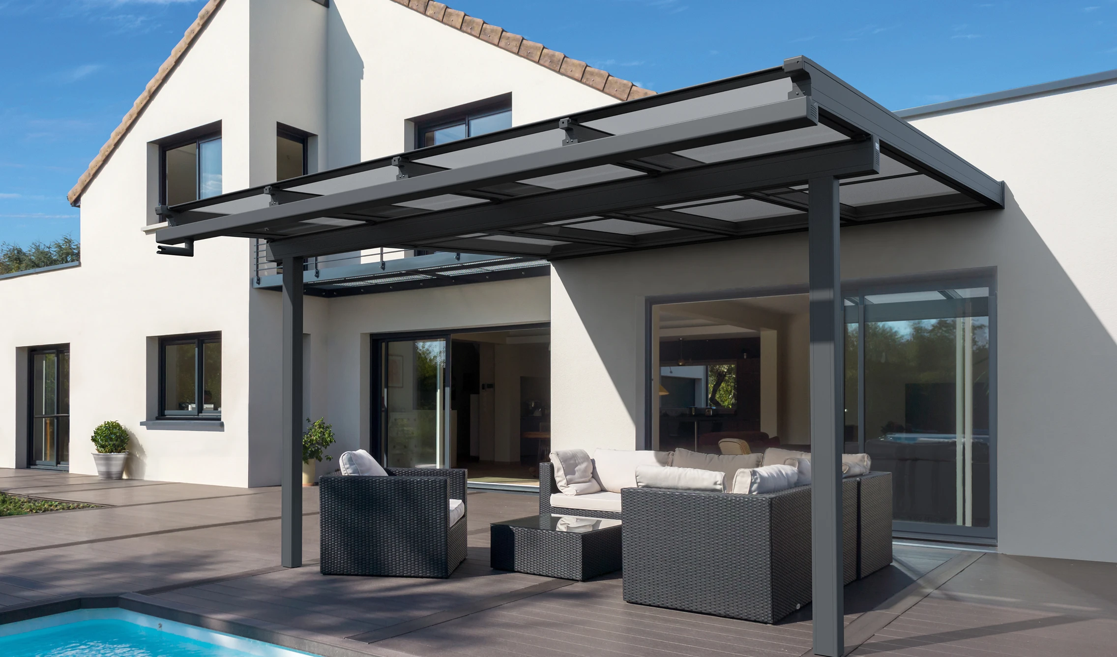 Es vereint Regenschutz und Transparenz eines Glasdachs mit dem Sonnenschutz und Komfort einer Markise. Unauffällig ins Wandprofil integriert, verschwindet das Tuch eingefahren im Design. Die Zip-Technologie schließt Lichtspalte und hält das Tuch straff, auch bei Wind. Mit LED, Heizstrahler oder Wetterautomatik wird es noch komfortabler – und wächst mit Glissando oder Finestra einfach mit.