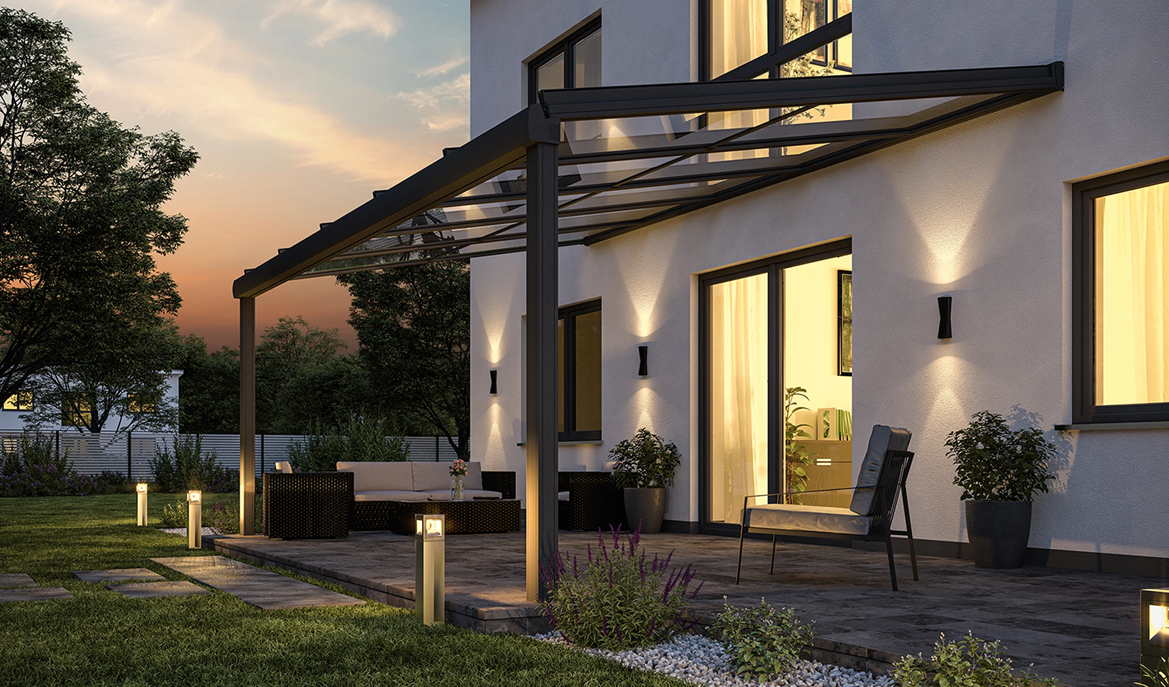 Vom ersten Sonnenstrahl bis in den Herbst: Das Murano Vetro verlängert die Terrassensaison mit einem transparenten Glasdach. Verschiedene Bauformen mit bündigen oder eingerückten Pfosten passen sich der Architektur an. Optional mit LED und Heizstrahler für Komfort bis in die Abendstunden.