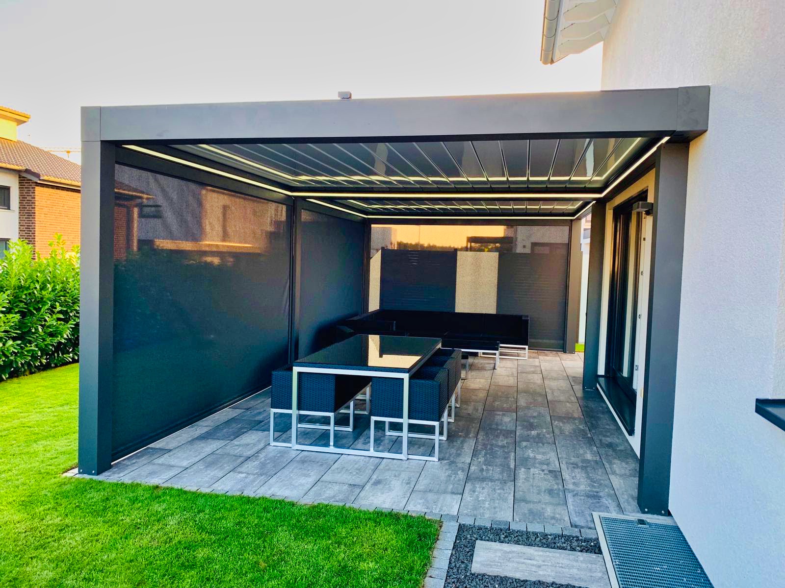 Lamellendächer repräsentieren die modernste Form des Outdoor-Living. Die motorisierten Aluminiumlamellen lassen sich auf Knopfdruck von 0° bis 124° neigen und ermöglichen so eine perfekte Steuerung von Licht, Schatten und Belüftung. Bei geschlossener Stellung sind die Lamellen 100% wasserdicht und schützen zuverlässig vor Regen. bedingungen reagieren – bei Regen schließen sich die Lamellen, bei Sonne öffnen sie sich für optimale Belüftung. Optional erhältliche LED-Spots in den Lamellen sorgen für eine elegante indirekte Beleuchtung. Unsere Lamellendächer sind ein architektonisches Statement und verwandeln Ihre Terrasse in ein modernes Outdoor-Wohnzimmer.