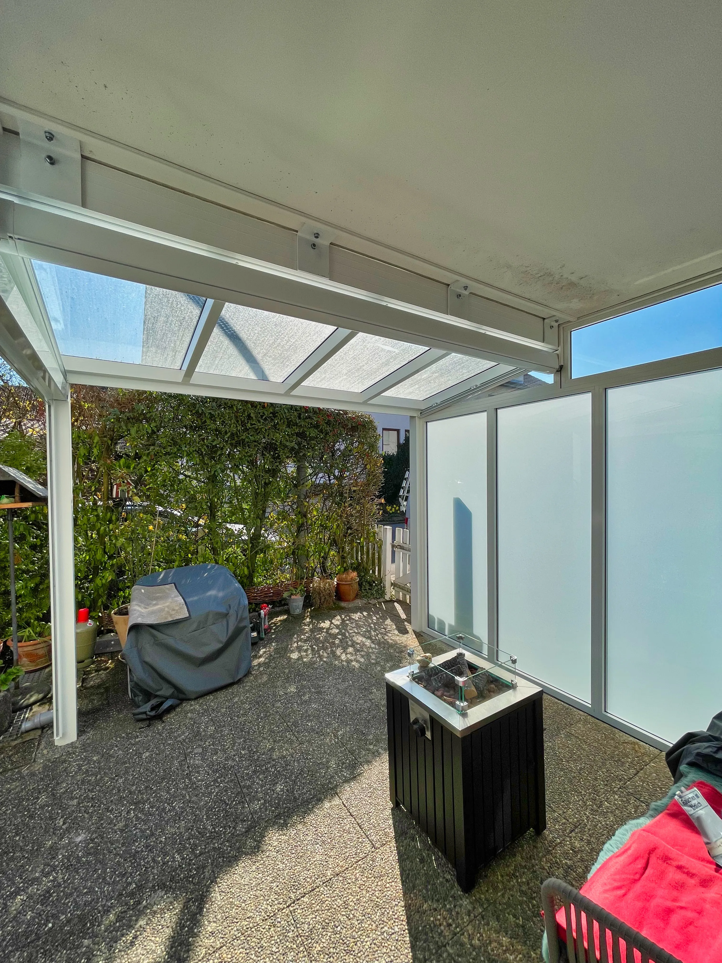 Transparentes Glasdach, das die Terrassensaison verlängert – mit LED und Heizstrahler optional.